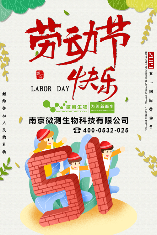 南京微測生物科技有限公司祝新老客戶朋友五一勞動節(jié)快樂!友情提示:2019年5月1日起至2019年5月4日放假,共計(jì)4天,放假期間不發(fā)貨,5月5日上班恢復(fù)正常發(fā)貨。