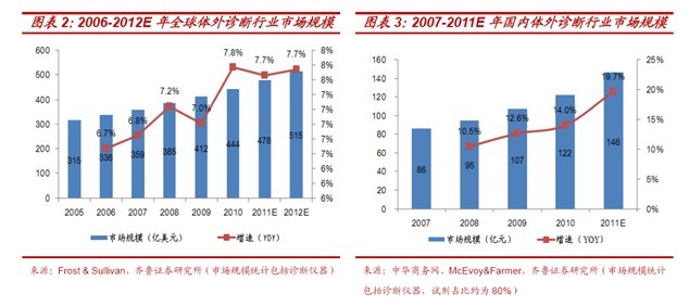 據(jù)McEvoy & Farmer 的市場報告《中國臨床診斷市場(2011)》預(yù)測,我國體外診斷行業(yè)未來增速有望達(dá)到15%-20%,遠(yuǎn)遠(yuǎn)超過全球5%-7%的增長,至2015 年成為全球第三大市場;